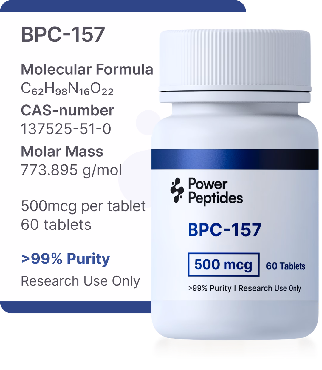 BPC-157 500mcg (60 oral tablets) contains precisely formulated pentadecapeptide in tablet form. This research compound has been studied for its angiogenic, anti-inflammatory, and tissue-regenerative properties in laboratory settings. Each tablet delivers 500mcg, with 60 tablets providing consistent supply for research-grade protocols. These products are intended for research purposes only and are not medications.